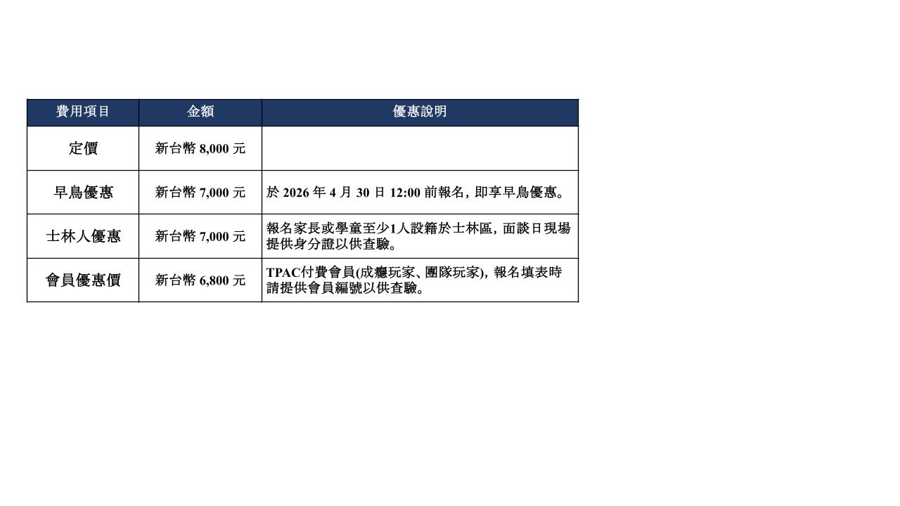 報名時間:2026年4月13日(一)中午12:00至6月1日(一)中午12:00