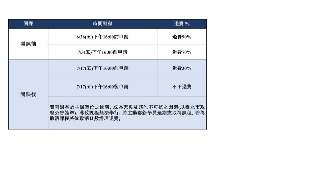 2.本課程為團體進行,如因學員個人因素缺課,課程恕無法另行補課亦無法退費。
