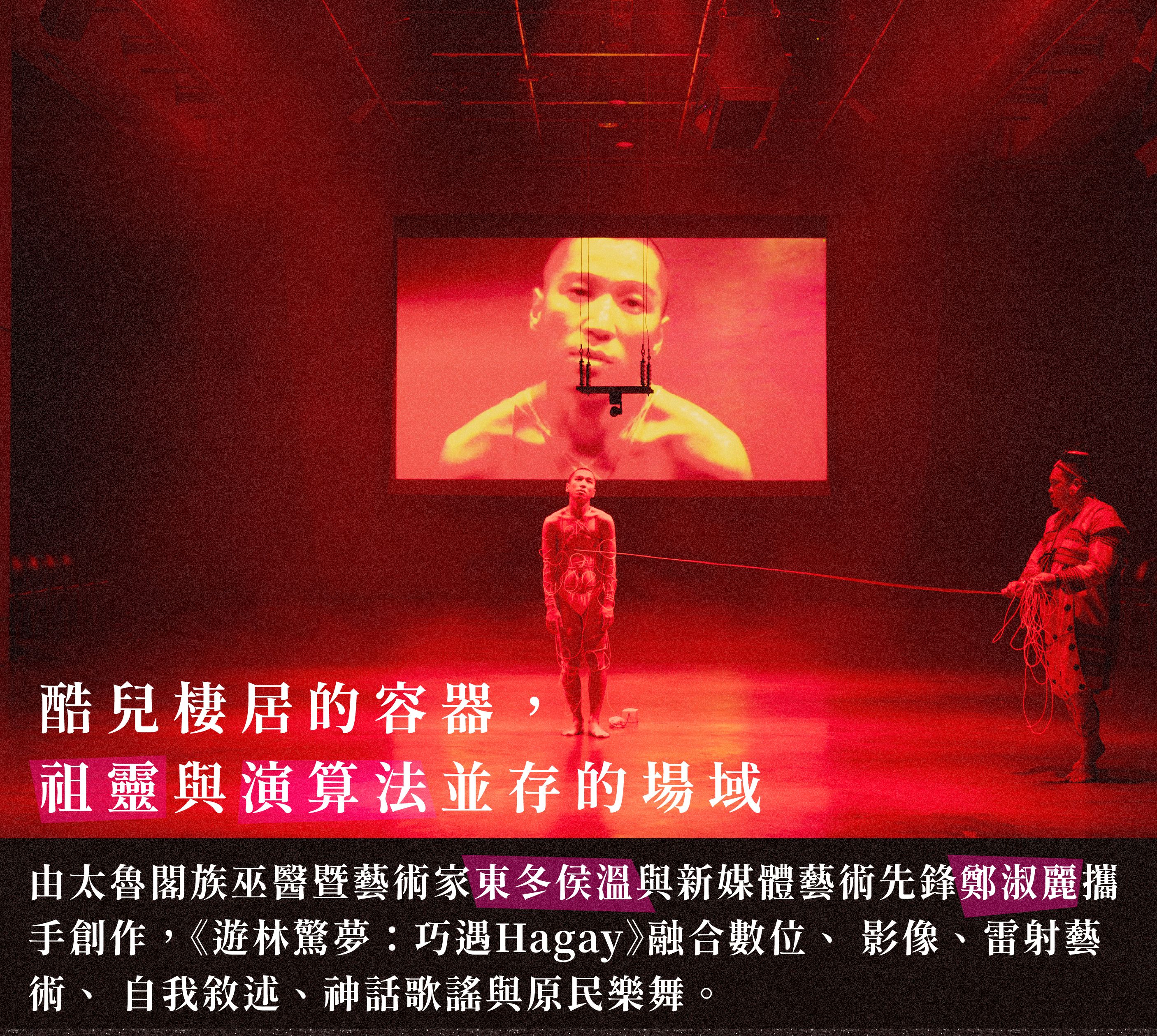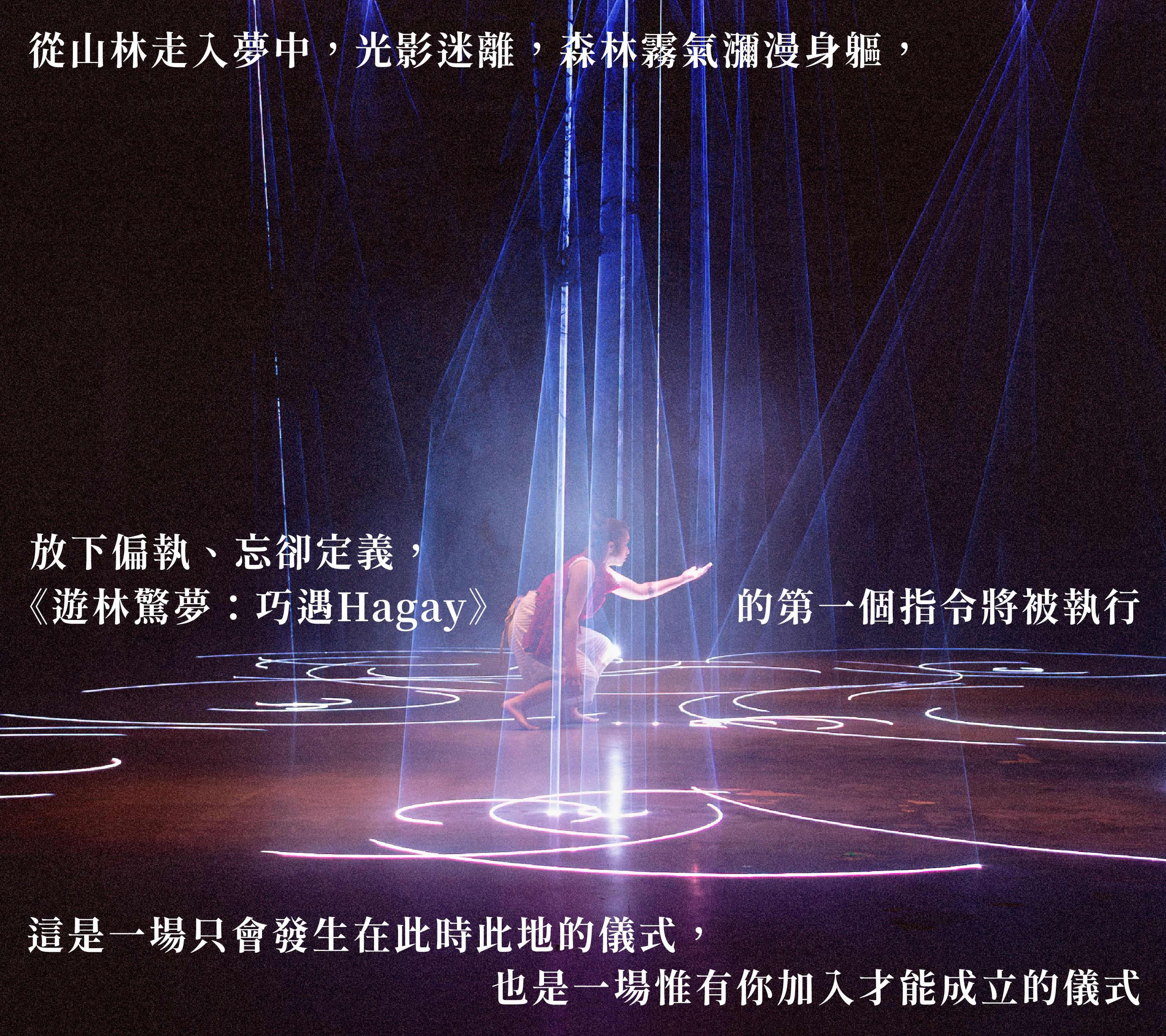 由太魯閣族儀式傳承者暨藝術家東冬・侯溫與新媒體藝術先鋒鄭淑麗攜手創作,《遊林驚夢:巧遇Hagay》融合數位、影像、雷射藝術、自我敘述、神話歌謠與原民樂舞,以東冬・侯溫臆造的獵人與 Hagay 靈群傳說為起點,融合Gaya 宇宙法則與Technoshamanism(科技薩滿主義)理念,鄭淑麗則將舞台設計揉引科技化為「編織」與「儀式」的延伸,牽引觀眾進入古老智慧與當代社會的交錯境地。